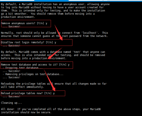 注意:在上圖中的Enter current passwdord for root處,我們直接敲回車鍵即可。因為centos7上mysql的默認root用戶密碼為空。上圖中主要是為root用戶配置密碼,并刷新相關(guān)權(quán)限。(密碼設(shè)為123456,只為實驗用,生產(chǎn)環(huán)境自定義)Remove anonymous users?刪除匿名用戶?Disallow root login remotely? 禁止root遠程登陸Remove test database and access to it? 刪除測試數(shù)據(jù)庫并且和訪問它Reload privilege tables now? 重新載入特權(quán)表上圖中主要是配置匿名用戶、test用戶以及root用戶遠程連接等相關(guān)配置。