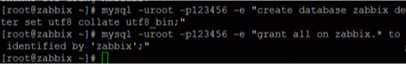 mysql -uroot -pPioneerservice@3306 -e "create database zabbix default character set utf8 collate utf8_bin;"mysql -uroot -pPioneerservice@3306 -e "grant all privileges on zabbix.* to zabbix@localhost identified by "zabbix""
