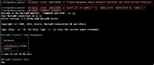 [root@zabbix ~]# mysql -uzabbix -pzabbix MariaDB [(none)]> show databases;MariaDB [(none)]> quit