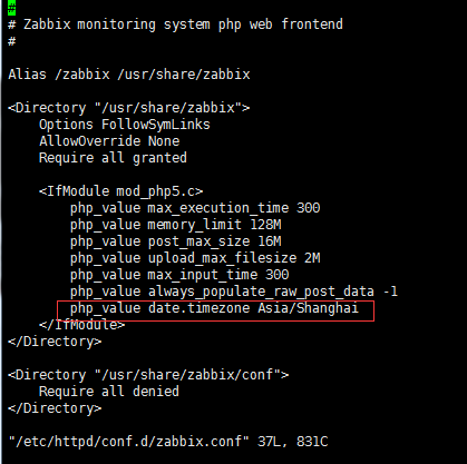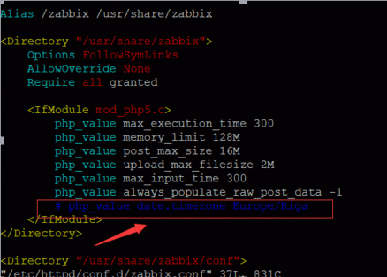 vim /etc/httpd/conf.d/zabbix.confAlias /zabbix /usr/share/zabbixOptions FollowSymLinksAllowOverride NoneRequire all grantedphp_value max_execution_time 300php_value memory_limit 128Mphp_value post_max_size 16Mphp_value upload_max_filesize 2Mphp_value max_input_time 300php_value always_populate_raw_post_data -1 php_value date.timezone Asia/Chongqing
