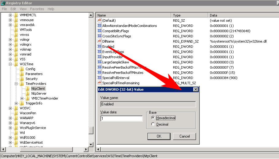 打開注冊表定位到:HKEY_LOCAL_MACHINE\SYSTEM\CurrentControlSet\Services\W32Time\TimeProviders\NtpClient 分支 將enable 值設為十進制1,表示啟用ntp client