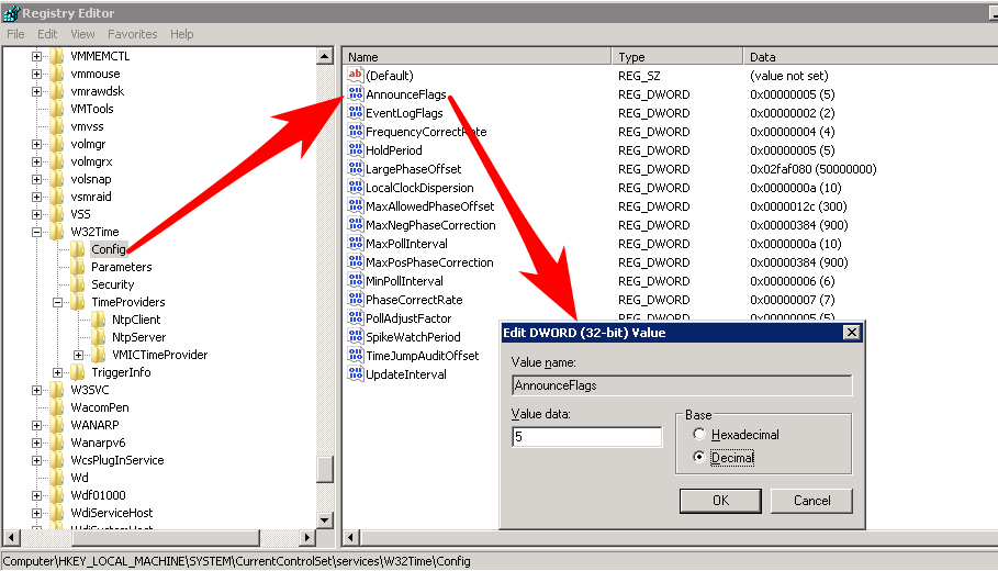 AnnounceFlags設為5表示以外部時間源為準進行同步,10表示以本機BIOS時間為準。