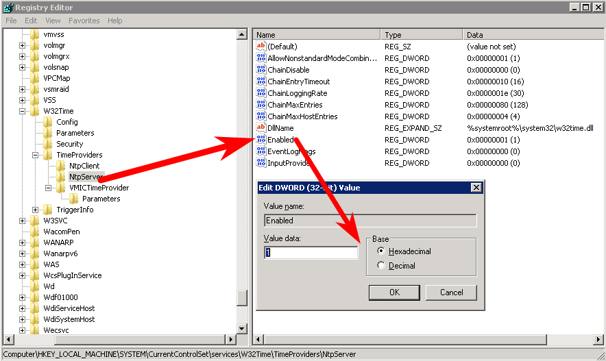 打開注冊表定位到:HKEY_LOCAL_MACHINE\SYSTEM\CurrentControlSet\Services\W32Time\TimeProviders\NtpServer 分支 將enable 值設為十進制1,表示啟用ntp server