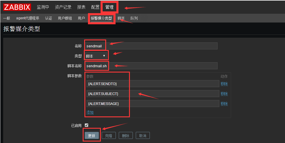 配置zabbix圖形化--管理--報(bào)警媒介類型--右上角創(chuàng)建媒體類型--傳入三個(gè)參數(shù)