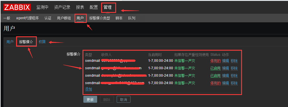 配置收件人和用戶權(quán)限--管理--用戶--報(bào)警媒介--選擇sendemail.sh腳本,輸入收件人的郵箱地址