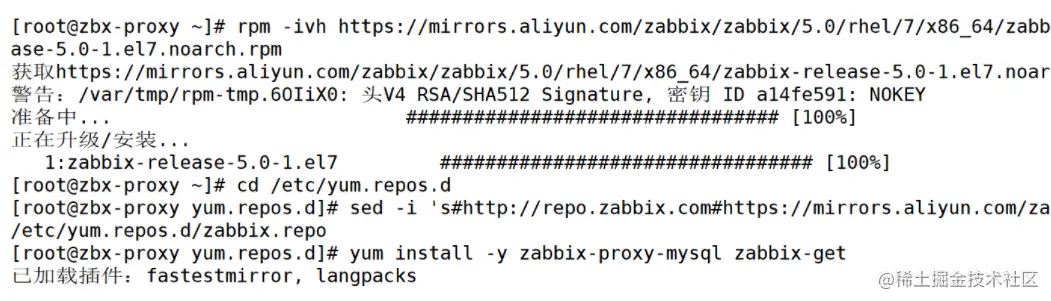 rpm -ivh https://mirrors.aliyun.com/zabbix/zabbix/5.0/rhel/7/x86_64/zabbix-release-5.0-1.el7.noarch.rpm cd /etc/yum.repos.dsed -i "s#http://repo.zabbix.com#https://mirrors.aliyun.com/zabbix#" /etc/yum.repos.d/zabbix.repoyum install -y zabbix-proxy-mysql zabbix-get