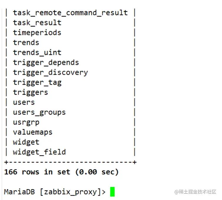 rpm -ql zabbix-proxy-mysql #查詢 sql 文件的位置zcat /usr/share/doc/zabbix-proxy-mysql-5.0.15/schema.sql.gz | mysql -uroot -pabc123 zabbix_proxy