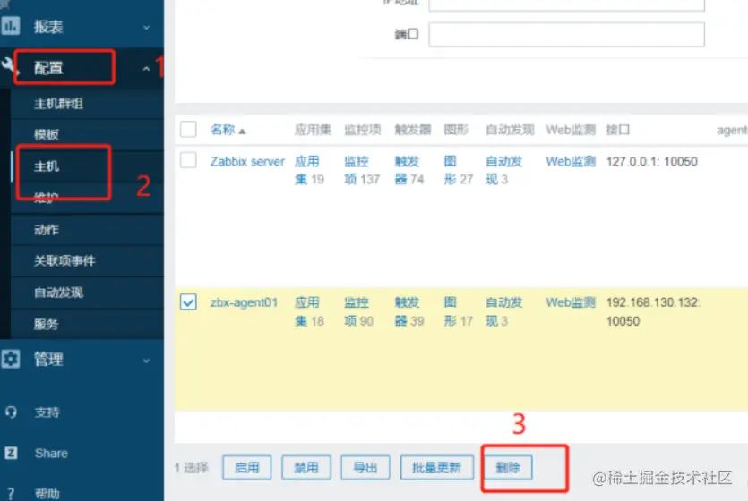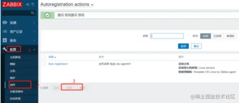 點擊左邊菜單欄【配置】中的【動作】,勾選自動注冊規則,點擊 禁用點擊左邊菜單欄【配置】中的【主機】,勾選原有的客戶端主機,點擊 刪除