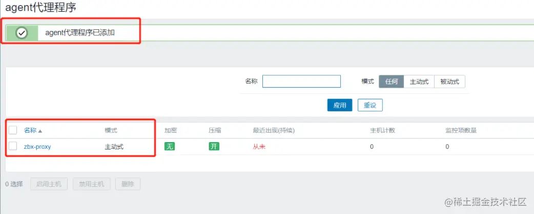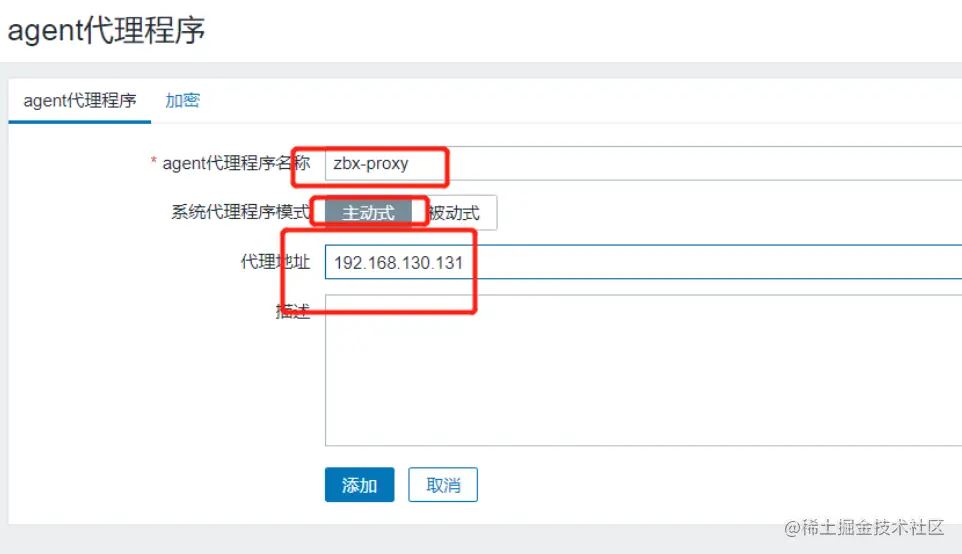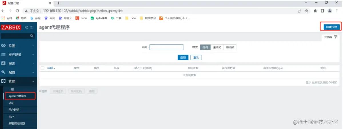 點擊左邊菜單欄【管理】中的【agent代理程序】,點擊【創建代理】【agent代理程序名稱】設置為 zbx-proxy【系統代理程序模式】選擇 主動式【代理地址】設置為 192.168.130.131點擊 【添加】