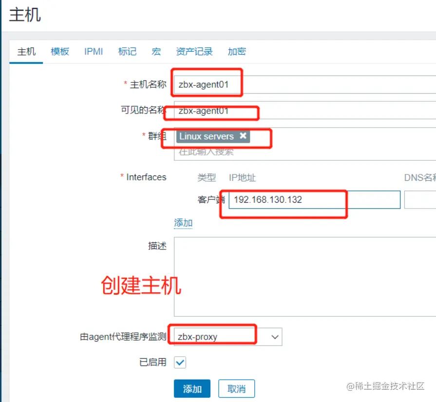點擊左邊菜單欄【配置】中的【主機】,點擊【創建主機】【主機名稱】設置成 zbx-agent01【可見的名稱】設置成 zbx-agent01【群組】選擇 Linux server【Interfaces】的【IP地址】設置成 192.168.80.30【由agent代理程序監測】選擇 zbx-proxy再點擊上方菜單欄【模板】【Link new tamplates】搜索 Linux ,選擇 Template OS Linux by Zabbix agent點擊 【添加】