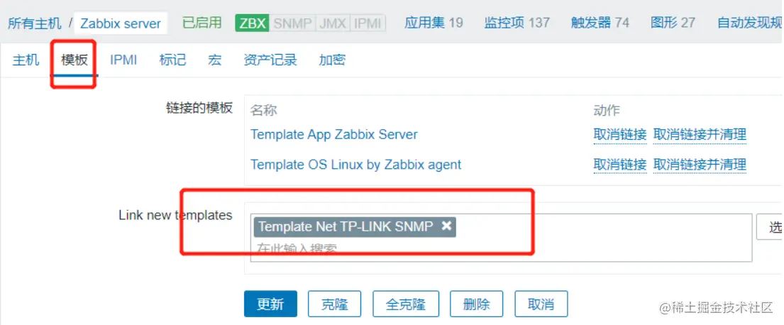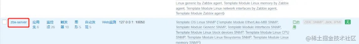 點擊左邊菜單欄【配置】中的【主機】,點擊 Zabbix server【Interfaces】點擊【添加】選擇 SNMP ,端口設置成 161點擊上方菜單欄【模板】,【鏈接的模板】中的所有 agent 模板選擇取消鏈接并清理再在【Link new templates】中搜索 Linux SNMP,選擇 Template OS Linux SNMP點擊 【更新】,等待一段時間后 Zabbix server 的可用性就變成了 SNMP 監控方式。