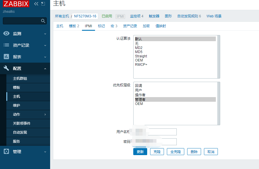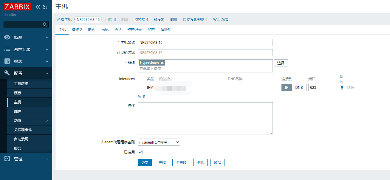 配置–主機–創建主機,客戶端填寫IPMI的IP,端口623