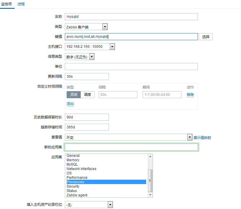 修改{hgh3a01:proc.num[,root,all,mysqld].last()}=0