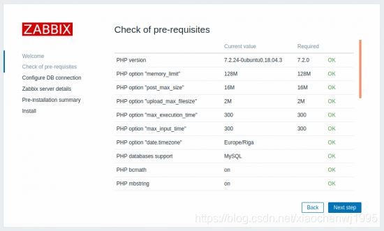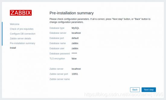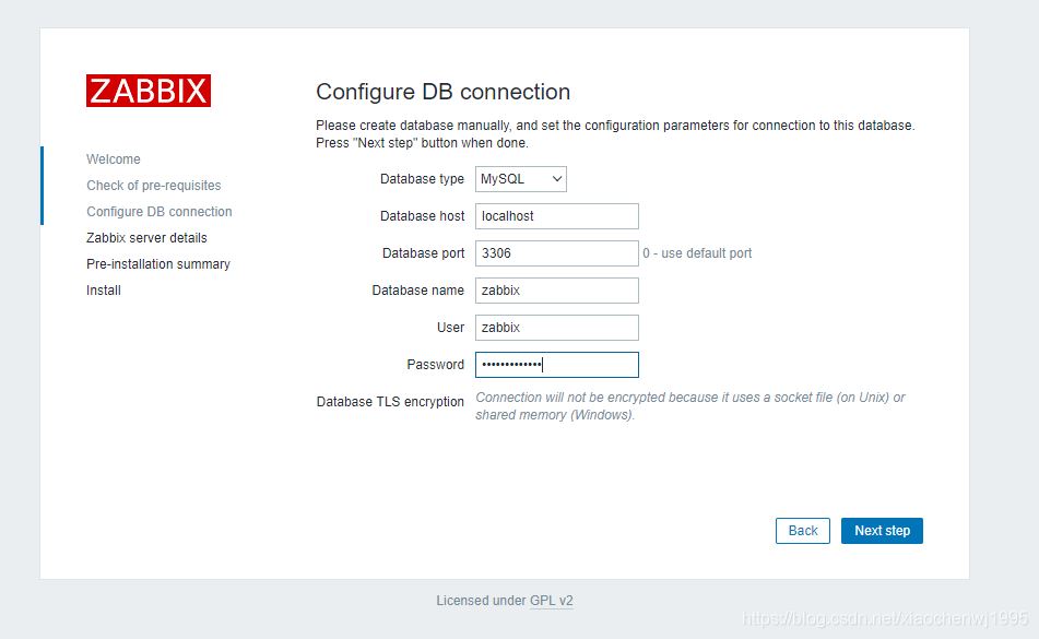 輸入連接到數據庫的詳細信息。Zabbix 數據庫必須已經創建