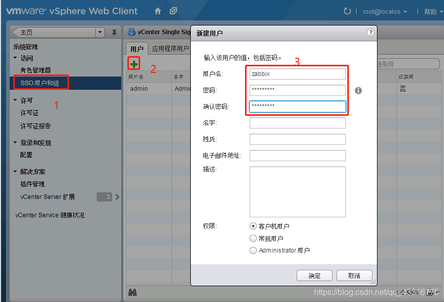 1、進(jìn)入虛擬化vcenter中,用瀏覽器登錄(客戶(hù)端沒(méi)找到地方設(shè)置),新建一個(gè)只讀用戶(hù)zabbix。