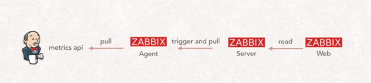 所以,我們需要在 Zabbix agent 所在機器放一個獲取 Jenkins 指標數據的腳本。再配置 Zabbix server 定時從該 agent 獲取數據,最后配置觸發器(trigger)實現告警。