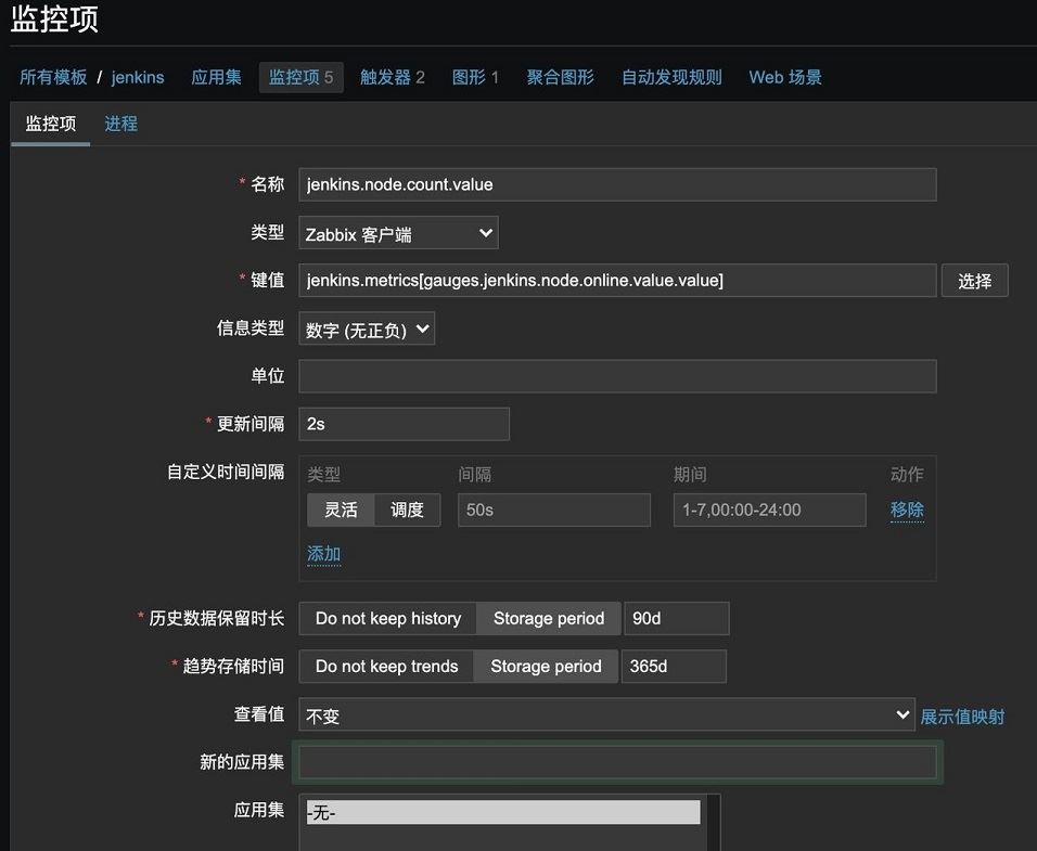 - 鍵值:由于我們要監控的指標并不是 Zabbix 預定義的。所以,需要使用用戶自定義參數來實現監控 Jenkins 指標。Key 填的值為:jenkins.metrics[gauges.jenkins.node.count.value.value]。jenkins.metrics是需要執行的真正的 Key 名稱。而 [] 內是傳給該 Key 對應的命令的參數。對于初學者,Zabbix 這部分概念非常不好理解。也許這樣會更好理解:在使用用戶自定義參數來實現監控的情況下,Zabbix server 會將這個 Key 發送給 agent,然后 agent 根據這個 Key 執行指定的 邏輯 以獲取指標數據。這個 邏輯 通常是一段腳本(shell命令或Python腳本等)。而腳本也是可以傳參的,[]中的值就是傳給腳本的參數。