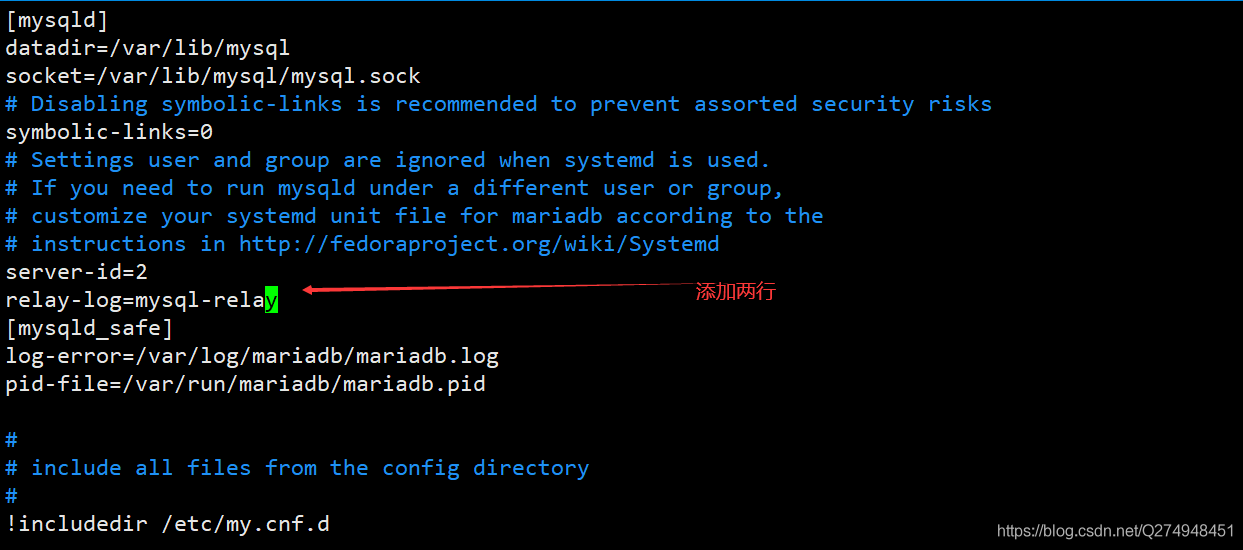 [root@localhost ~]# systemctl restart mariadb[root@localhost ~]# mysqlWelcome to the MariaDB monitor. Commands end with ; or \g.Your MariaDB connection id is 4Server version: 5.5.65-MariaDB MariaDB ServerCopyright (c) 2000, 2018, Oracle, MariaDB Corporation Ab and others.Type "help;" or "\h" for help. Type "\c" to clear the current input statement.MariaDB [(none)]> show slave status \G;*************************** 1. row *************************** Slave_IO_State: Waiting for master to send event Master_Host: 192.168.27.136 Master_User: tom Master_Port: 3306 Connect_Retry: 60 Master_Log_File: mysql-bin.000001 Read_Master_Log_Pos: 199126 Relay_Log_File: mysql-relay.000006 Relay_Log_Pos: 3950 Relay_Master_Log_File: mysql-bin.000001 Slave_IO_Running: Yes Slave_SQL_Running: Yes Replicate_Do_DB: Replicate_Ignore_DB: Replicate_Do_Table: Replicate_Ignore_Table: Replicate_Wild_Do_Table: Replicate_Wild_Ignore_Table: Last_Errno: 0 Last_Error: Skip_Counter: 0 Exec_Master_Log_Pos: 199126 Relay_Log_Space: 4240 Until_Condition: None Until_Log_File: Until_Log_Pos: 0 Master_SSL_Allowed: No Master_SSL_CA_File: Master_SSL_CA_Path: Master_SSL_Cert: Master_SSL_Cipher: Master_SSL_Key: Seconds_Behind_Master: 0Master_SSL_Verify_Server_Cert: No Last_IO_Errno: 0 Last_IO_Error: Last_SQL_Errno: 0 Last_SQL_Error: Replicate_Ignore_Server_Ids: Master_Server_Id: 11 row in set (0.00 sec)