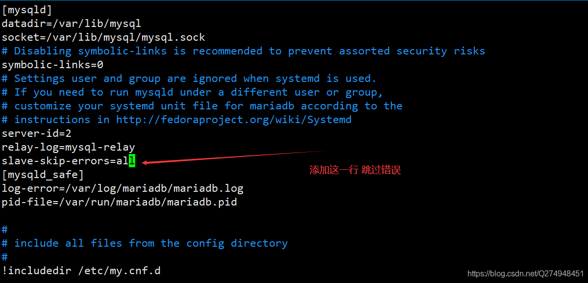 [root@localhost ~]# systemctl restart mariadb[root@localhost ~]# mysqlWelcome to the MariaDB monitor. Commands end with ; or \g.Your MariaDB connection id is 2Server version: 5.5.65-MariaDB MariaDB ServerCopyright (c) 2000, 2018, Oracle, MariaDB Corporation Ab and others.Type "help;" or "\h" for help. Type "\c" to clear the current input statement.MariaDB [(none)]> change master to -> master_host="192.168.27.136", -> master_user="tom", -> master_password="123", -> master_log_file="mysql-bin.000001", -> master_log_pos=175170;Query OK, 0 rows affected (0.01 sec)MariaDB [(none)]> start slave;Query OK, 0 rows affected (0.00 sec)MariaDB [(none)]> show slave status \G;*************************** 1. row *************************** Slave_IO_State: Waiting for master to send event Master_Host: 192.168.27.136 Master_User: tom Master_Port: 3306 Connect_Retry: 60 Master_Log_File: mysql-bin.000001 Read_Master_Log_Pos: 175170 Relay_Log_File: mysql-relay.000004 Relay_Log_Pos: 529 Relay_Master_Log_File: mysql-bin.000001 Slave_IO_Running: Yes Slave_SQL_Running: No Replicate_Do_DB: Replicate_Ignore_DB: Replicate_Do_Table: Replicate_Ignore_Table: Replicate_Wild_Do_Table: Replicate_Wild_Ignore_Table: Last_Errno: 1146 Last_Error: Error "Table "zabbix.history_uint" doesn"t exist" on query. Default database: "zabbix". Query: "insert into history_uint (itemid,clock,ns,value) values (23287,1602301747,810415730,1)" Skip_Counter: 0 Exec_Master_Log_Pos: 173424 Relay_Log_Space: 2565 Until_Condition: None Until_Log_File: Until_Log_Pos: 0 Master_SSL_Allowed: No Master_SSL_CA_File: Master_SSL_CA_Path: Master_SSL_Cert: Master_SSL_Cipher: Master_SSL_Key: Seconds_Behind_Master: NULLMaster_SSL_Verify_Server_Cert: No Last_IO_Errno: 0 Last_IO_Error: Last_SQL_Errno: 1146 Last_SQL_Error: Error "Table "zabbix.history_uint" doesn"t exist" on query. Default database: "zabbix". Query: "insert into history_uint (itemid,clock,ns,value) values (23287,1602301747,810415730,1)" Replicate_Ignore_Server_Ids: Master_Server_Id: 11 row in set (0.00 sec)ERROR: No query specified