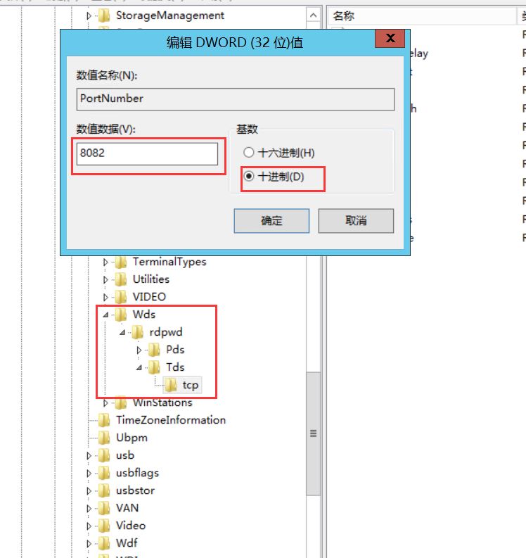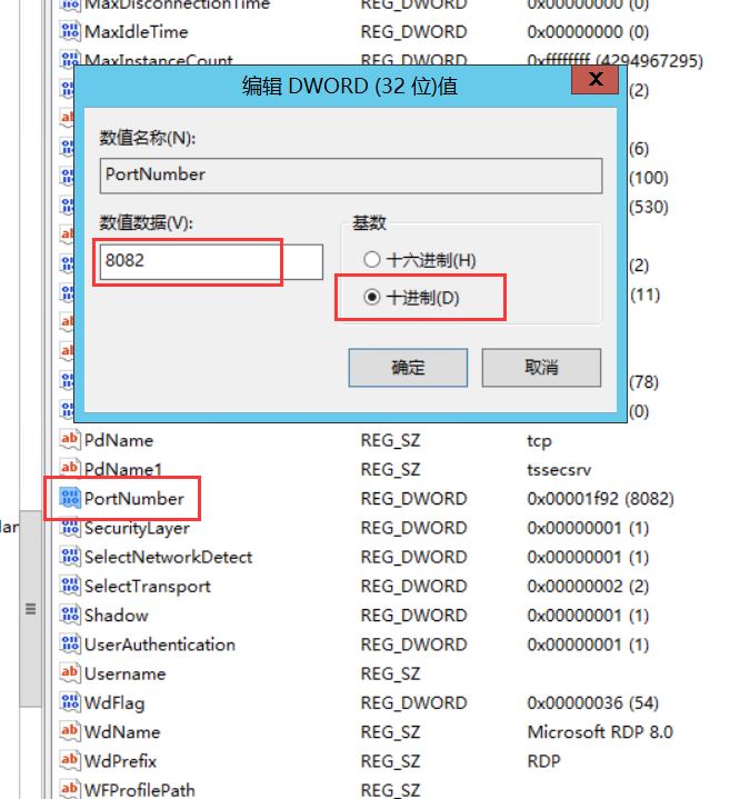 找到后,按照下列圖示步驟找到遠程桌面端口號并進行修改,注意是修改兩個注冊表數值,需要統一,這里我設置為8082,避免使用熟知端口