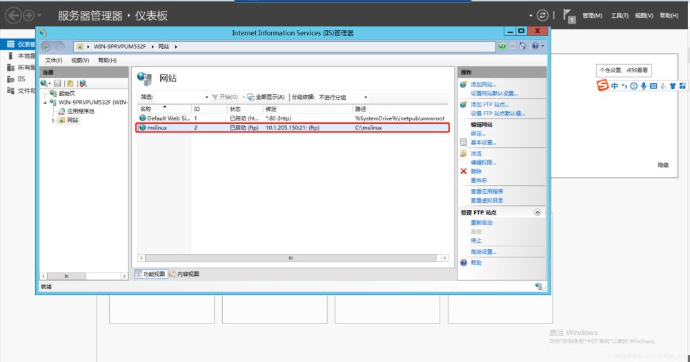 windwos鍵–》服務(wù)器管理器–》工具–》IIS管理器–》擴(kuò)展服務(wù)器(顯示網(wǎng)站并點(diǎn)擊)–》配置ftp站點(diǎn)名稱及物理路徑–》下一步–》選擇綁定IP地址(和無ssl)–》下一步–》身份驗(yàn)證配置–》授權(quán)的用戶–》權(quán)限配置完成