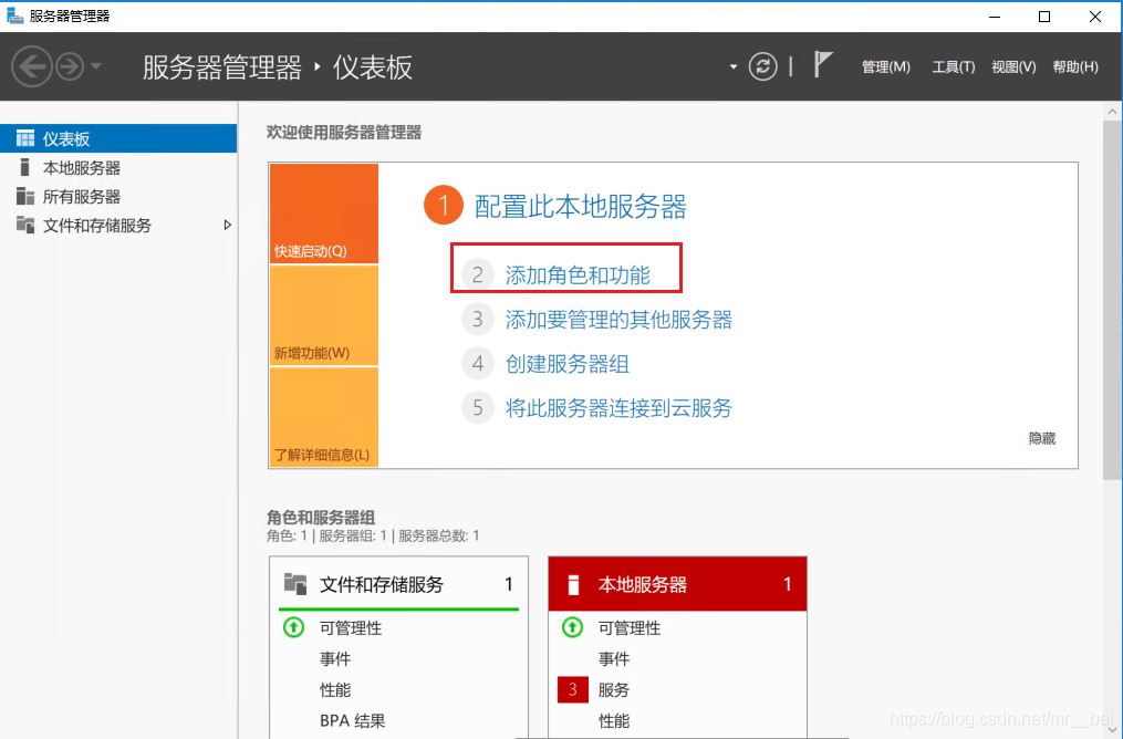 (可右擊我的電腦選擇“管理”打開(kāi);或者直接選擇桌面左下角“服務(wù)器管理器”圖標(biāo))。 點(diǎn)擊添加角色和功能。