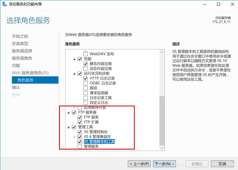 5、角色服務(wù)中勾選FTP服務(wù),如果管理工具中IIS項(xiàng)也最好勾選上,如圖。