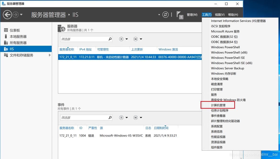 7、回到“服務(wù)器管理器”,從工具欄選擇IIS管理器。