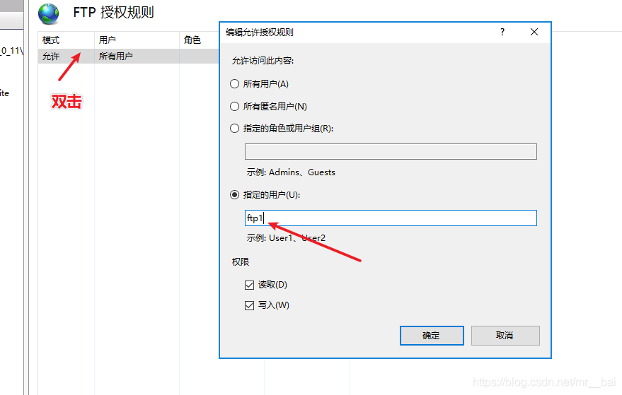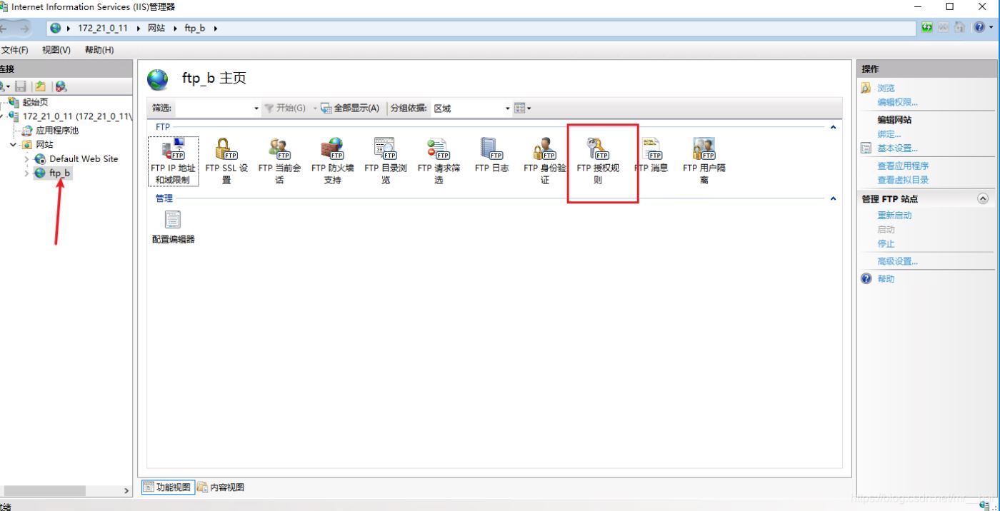 再次打開(kāi)IIS管理器選擇剛剛創(chuàng)建的FTP站點(diǎn)、打開(kāi)FTP授權(quán)規(guī)則、修改用戶(hù)權(quán)限。