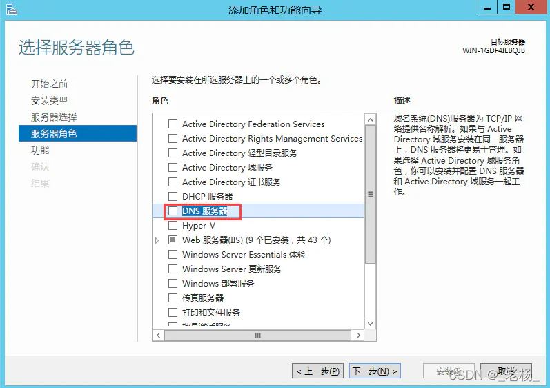 彈出界面一直按默認選項點擊下一步,到選擇服務(wù)器角色界面,選擇 “DNS服務(wù)器” 點擊下一步,然后一直按默認設(shè)置點擊下一步直到安裝完成。