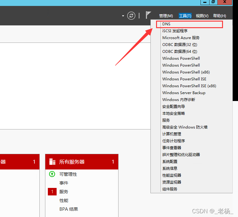 從服務(wù)管理器右側(cè)頂部的工具菜單中選擇 “DNS” 彈出配置頁面: