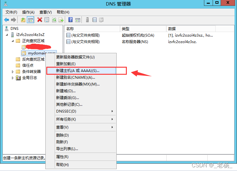 在正向查找區(qū)域下選中剛才新建的域名 mydomain.com 右鍵點擊新建主機