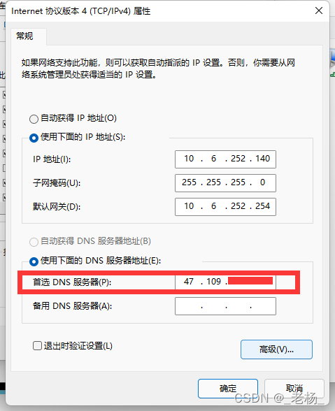 3、使用一臺遠程客戶機,將客戶機的DNS設(shè)置為剛才配置DNS服務(wù)的Windows Server 的服務(wù)器的IP: