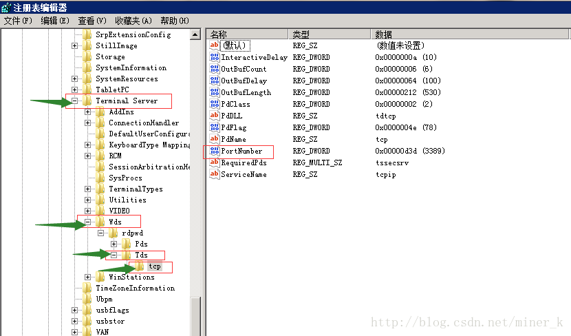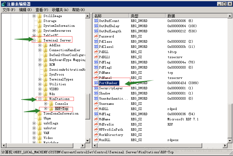 [HKEY_LOCAL_MACHINE\SYSTEM\CurrentControlSet\Control\Terminal Server\Wds\rdpwd\Tds\tcp]其下的”PortNumber”鍵值所對應的就是端口號,此處設置為2121