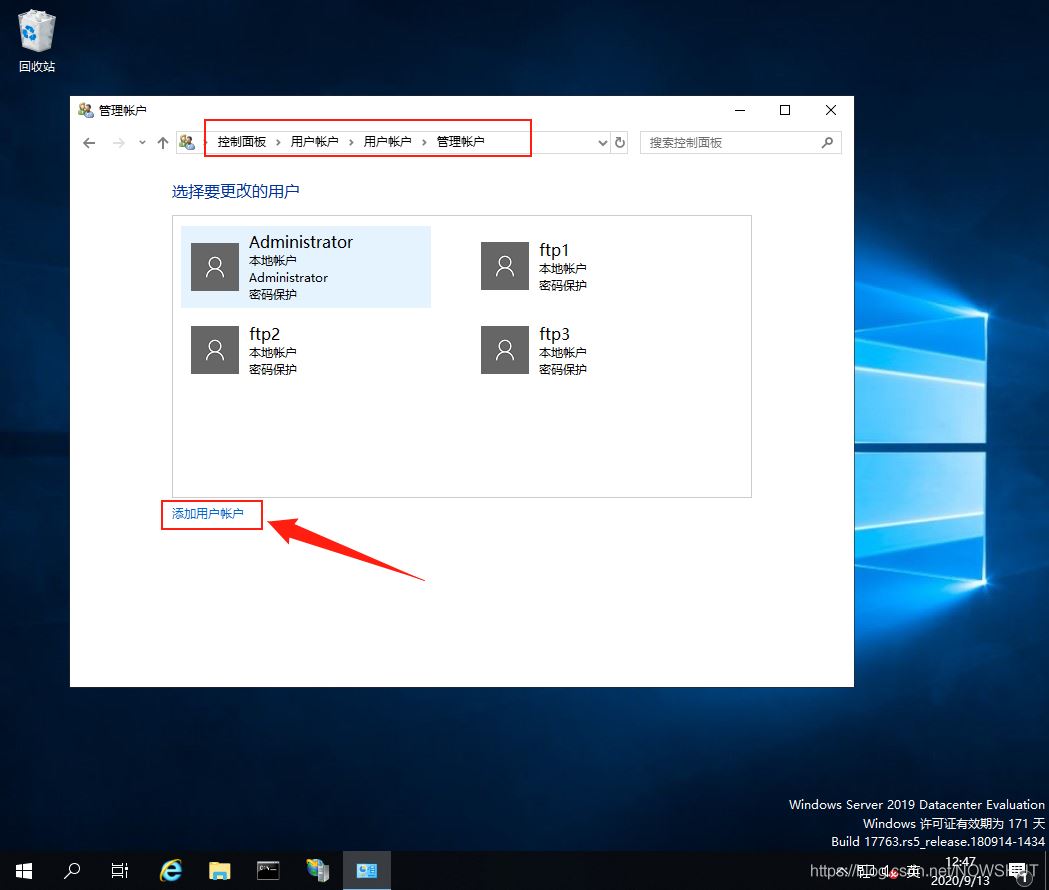 (1)在FTP服務器上打開【控制面板】——>【用戶賬戶】——>【用戶賬戶】——>【管理其他賬戶】——>【添加用戶賬戶】