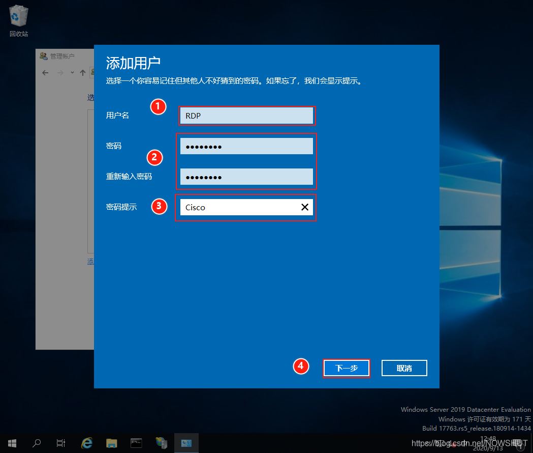 (2)輸入新用戶的用戶名、密碼及密碼提示,點擊【下一步】