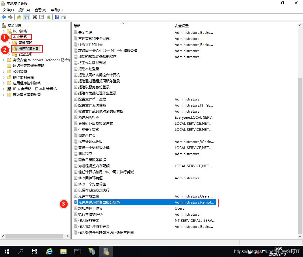 (2)依次展開【本地策略】——>【用戶權限分配】,在右側窗口中雙擊【允許通過遠程桌面服務登錄】。