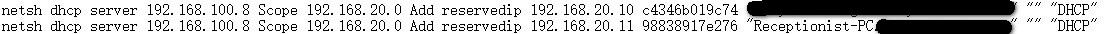 netsh dhcp server192.168.100.8 Scope 192.168.20.0 Add reservedip 192.168.20.10 c4346b019c74"hosdflcameeting01.hosdfldomain.com" "" "DHCP"