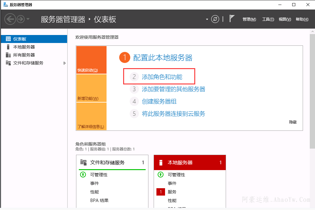 2、在彈出的服務(wù)器管理器界面找到添加角色和功能