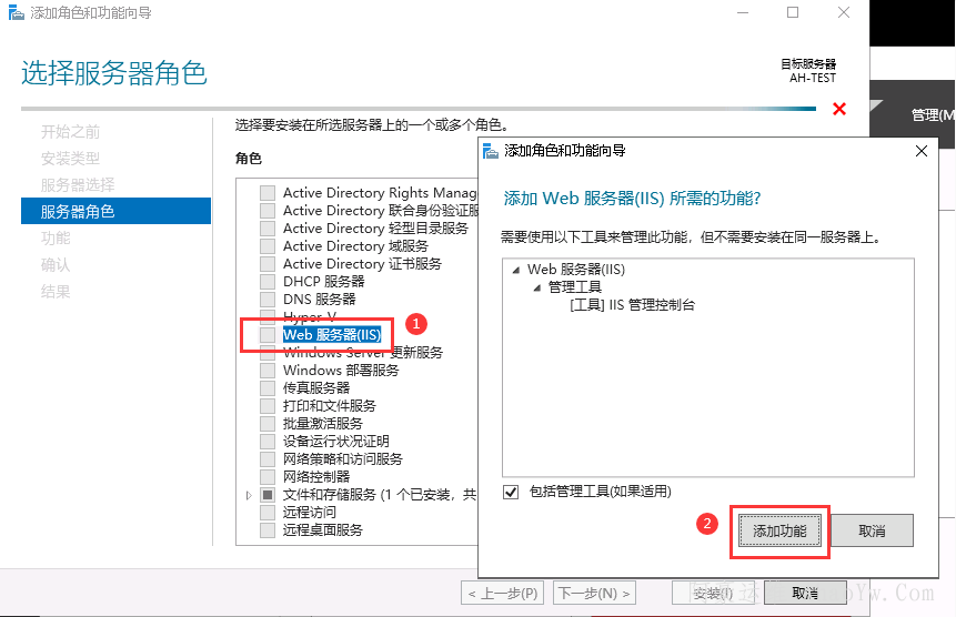 6、選擇:Web服務(wù)器(IIS),在彈出的對(duì)話框選擇添加功能