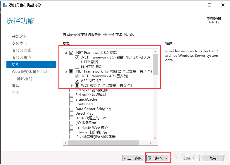 8、勾選NET功能,繼續(xù)點(diǎn)擊下一步(需要NET3.5和NET4.6就把NET3.5和NET4.6功能選項(xiàng)打鉤)