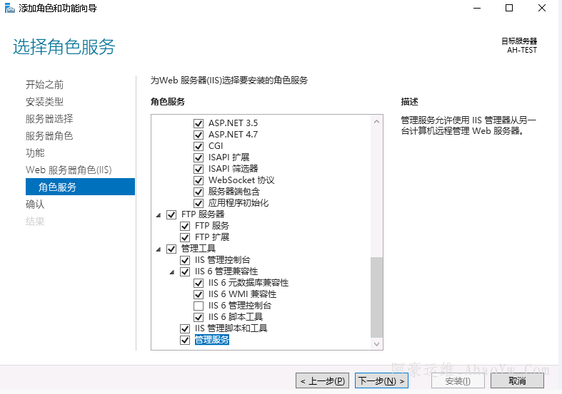 10.6、勾選FTP服務(wù)器(打開(kāi)FTP功能)和管理工具如下,勾選完上述如下功能后繼續(xù)點(diǎn)擊下一步