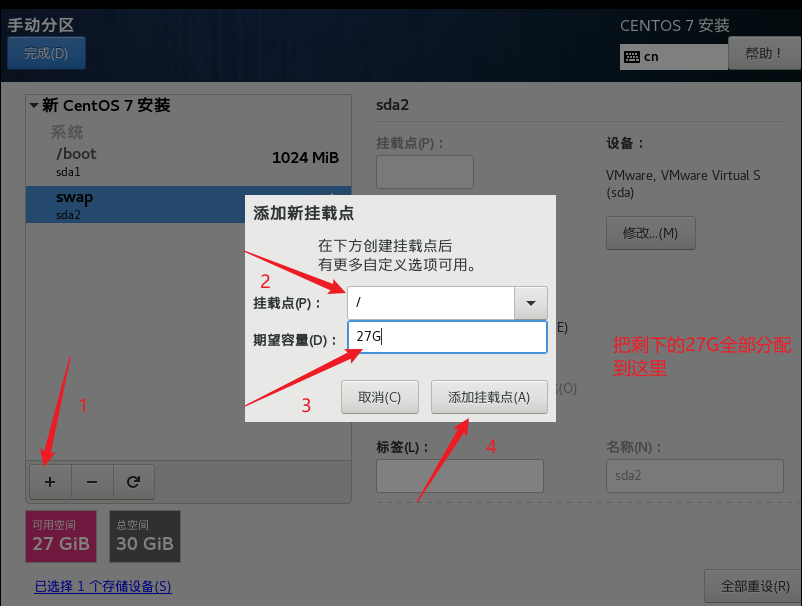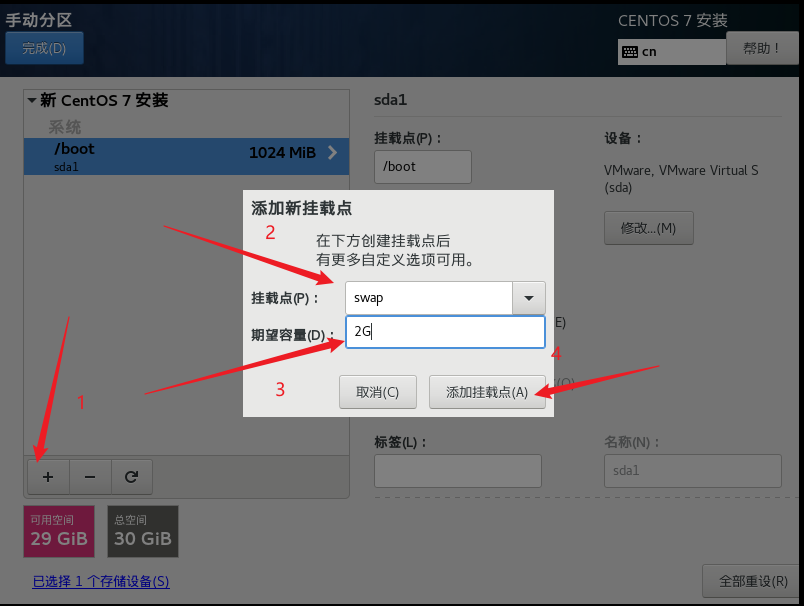指定/boot 分區,即引導分區,大小為1G, 然后點擊添加掛載點.