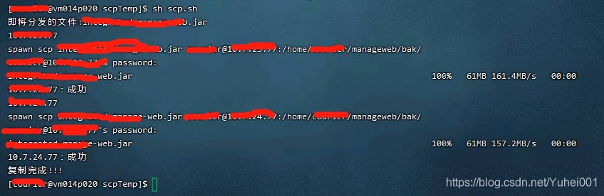 #!/bin/bashecho "拷貝情況如下:" > test.logn=`cat demoIplist.txt | wc -l` #分發(fā)的ip數(shù)量fileName=demo-web.jar #分發(fā)文件名echo "即將分發(fā)的文件:$fileName"for ((i=1; i <= $n; i++))dopasswd=`cat demoPassword.txt | head -$i | tail -1`ip=`cat demoIplist.txt | head -$i | tail -1`echo $ip##自動交互expect <<EOFspawn scp $fileName xxyyzz@$ip:/home/xxyyzz/manageweb/bak/expect "yes/no" {send "yes\n;exp_untinue"}expect "password" {send "$passwd\n"}expect eofEOFif [ $? -eq 0 ];thenecho "$ip:成功" >>demoScpLog.logecho "$ip:成功"elseecho "$ip:失敗" >>demoScpLog.logecho "$ip:失敗"fi doneecho "復(fù)制完成!!!"腳本解析: