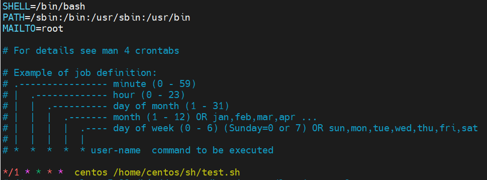 SHELL=/bin/bashPATH=/sbin:/bin:/usr/sbin:/usr/binMAILTO=HOME=/# run-parts51 * * * * root run-parts /etc/cron.hourly24 7 * * * root run-parts /etc/cron.daily22 4 * * 0 root run-parts /etc/cron.weekly42 4 1 * * root run-parts /etc/cron.monthly
