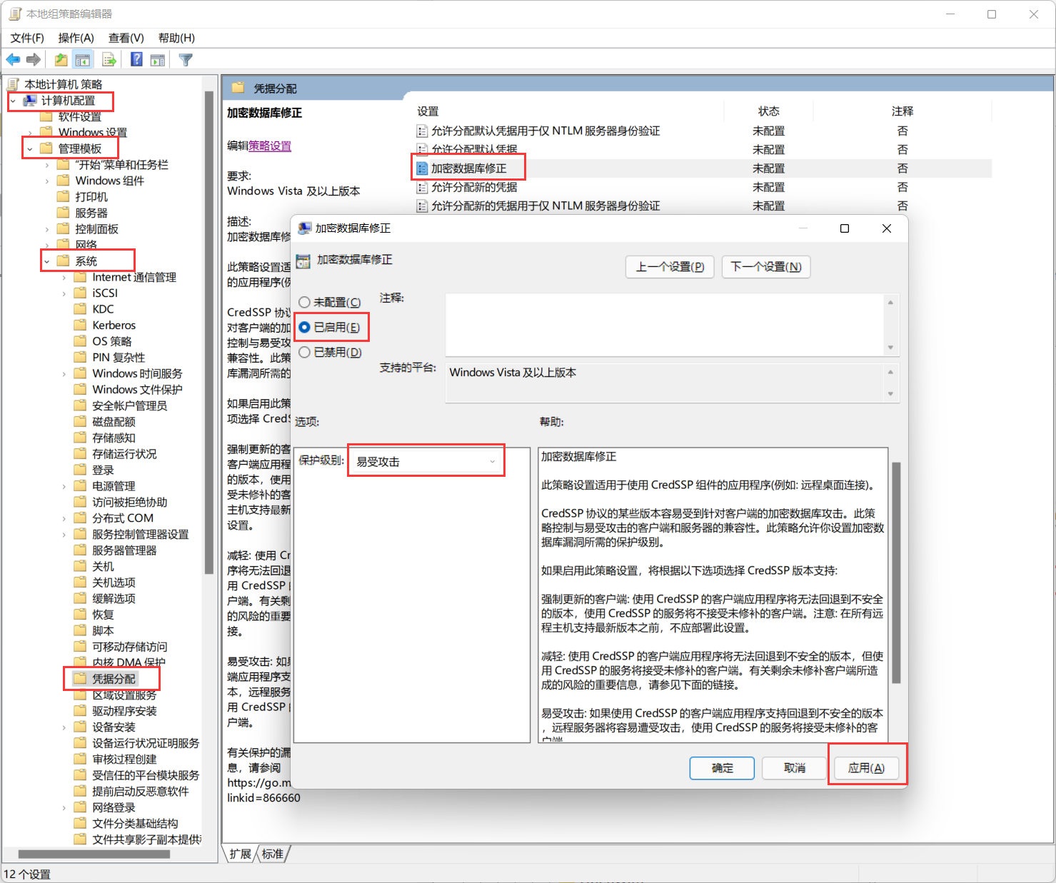 修改策略:改為已啟用,保護(hù)級別改為易受攻擊