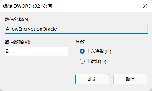 最后新建值:類型為DWORD(32位),名稱為AllowEncryptionOracle,值為2