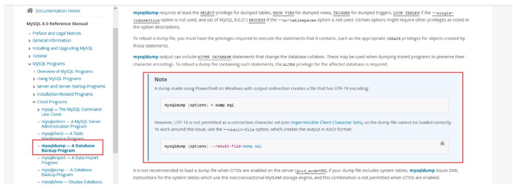 - 最后在MySQL官網(wǎng)找到一段 mysqldump 相關(guān)的說明,在這段代碼中找到了解決方案(https://dev.mysql.com/doc/refman/8.0/en/mysqldump.html)