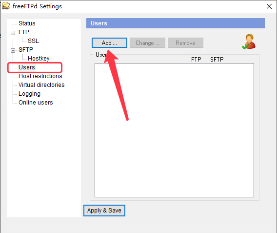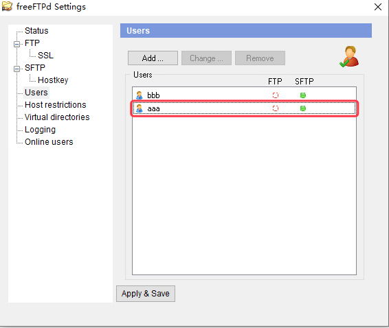 以管理員權限打開freeFTPd,如果以普通用戶打開freeFTPd,將無法保存配置。