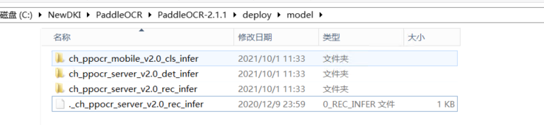 解壓到PaddleOCR-release-2.0\deploy\model 目錄下(手工創(chuàng)建model文件夾),如下圖: